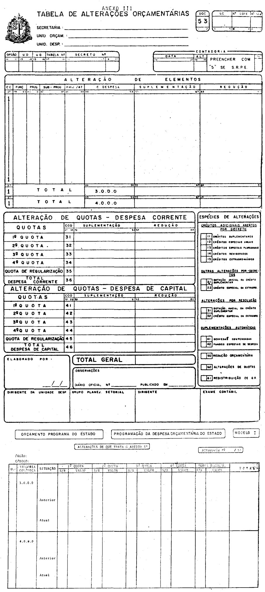 Artigo 11 - As alterações de Tabelas de Distribuição, observada a Programação da Despesa Orçamentária do Estado, após estudos dos órgãos do Sistema de Administração Financeira e Orçamentária, serão baixadas conforme Anexo III, pelos Secretirios de Estado e/ou Dirigentes de Órgãos dos Poderes Legislativo e Judiciário ou Dirigentes de Unidades Orçamentárias com poderes delegados para tal, passando a vigorar após o registro na unidade competente da Contadoria Geral do Estado.