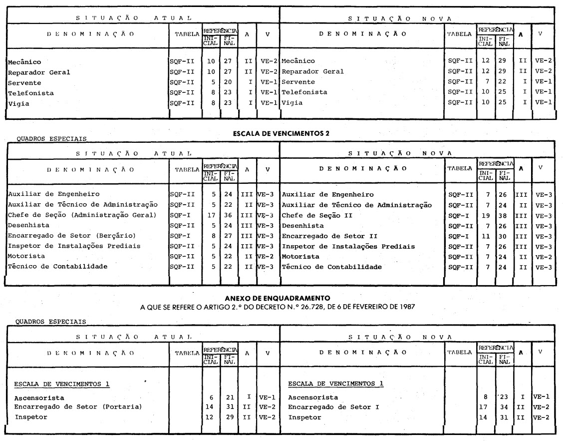 referentes aos Quadros Especiais que especifica, bem como os valores de