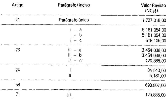 Valores revistos, constantes dos artigos 21, parágrafo único, 23, incisos I e II e respectivas alíneas "a" a "c", 24, incisos I e II, 58 e 71, inciso III da Lei n ° 6.544, de 22 de novembro de 1989, válidos para o trimestre civil de outubro a dezembro de 1989.