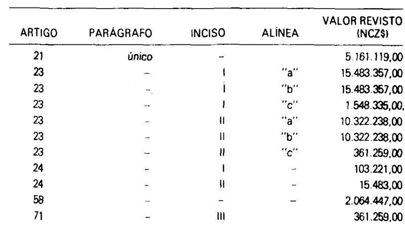 Valores revistos constantes dos Artigos 21, parágrafo único, 23, inciso