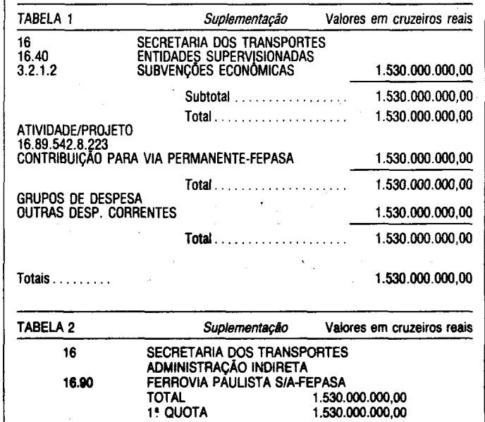 de cruzeiros reais), suplementar ao orçamento da Secretaria dos