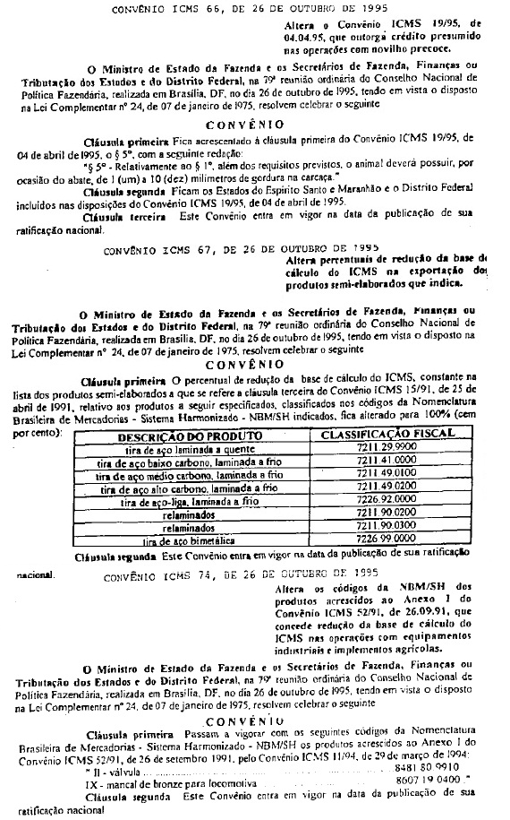 - o Convênio ICMS-66/95, acrescenta dispositivo ao Convênio
