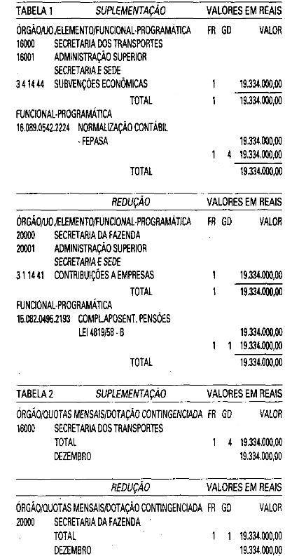 Dispõe sobre abertura de crédito suplementar ao Orçamento Fiscal na Secretaria dos Transportes para repasse á FEPASA-Ferrovia Paulista S/A, visando ao atendimento de despesas Correntes