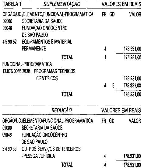 Dispõe sobre abertura de crédito suplementar ao Orçamento da Seguridade Social na Fundação Oncocentro de São Paulo, visando ao atendimento de despesas de Capital