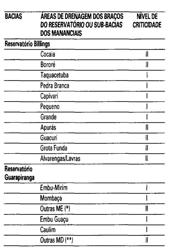 de drenagem dos braços dos reservatórios ou sub-bacias