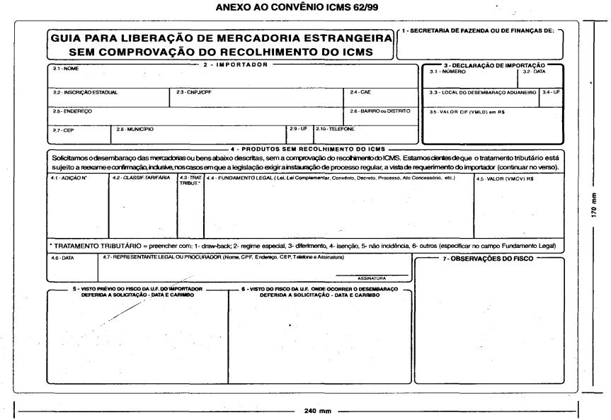1 - o Convênio ICMS-62/99 aprova novo modelo da Guia para Liberação de