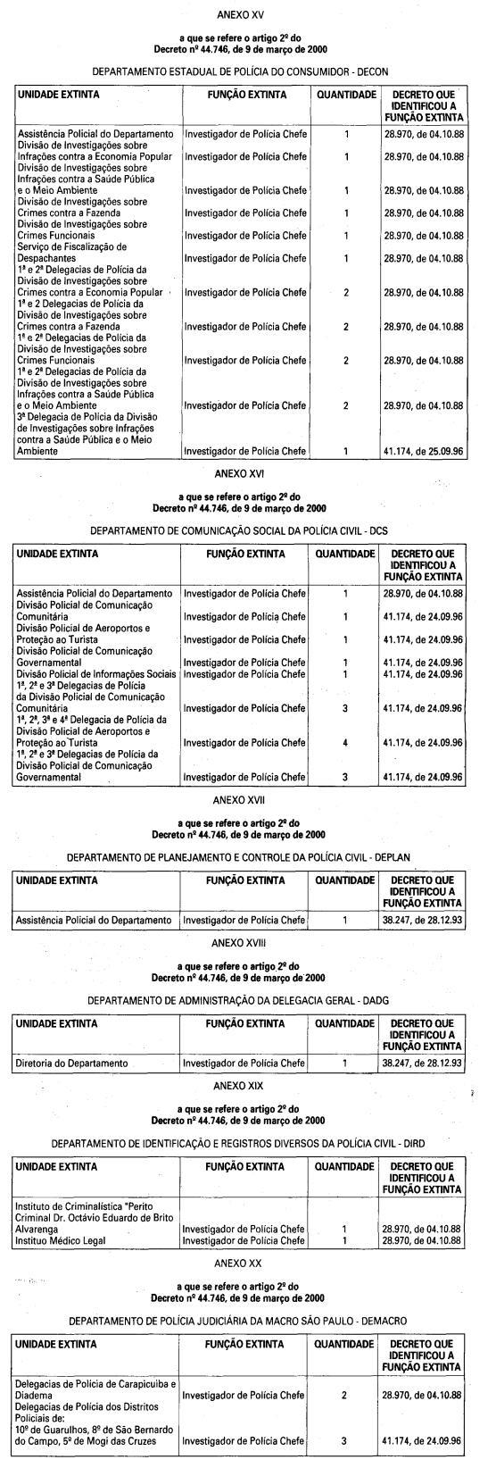 Artigo 2.º - Ficam extintas as funções identificadas para fins de atribuição da gratificação "pro labore" com fundamento no artigo 11 da Lei Complementar n.º 547, de 24 de junho de 1988, em decorrência do disposto no artigo 1.º da Lei Complementar n.º 756, de 24 de junho de 1994, regulamentada pelo Decreto n.º 42.847, de 9 de fevereiro de 1998 e no artigo 1.º do Decreto n.º 43.792, de 8 de Janeiro de 1999, artigo 29 do Decreto n.º 43.851, de 17 de fevereiro de 1999 e inciso I do artigo 22 do Decreto n.º 44.260, de 17 de setembro de 1999 e no artigo 41 do Decreto n.º 44.448, de 24 de novembro de 1999, na conformidade dos Anexos XIV a 'XX, que fazem parte integrante deste decreto.