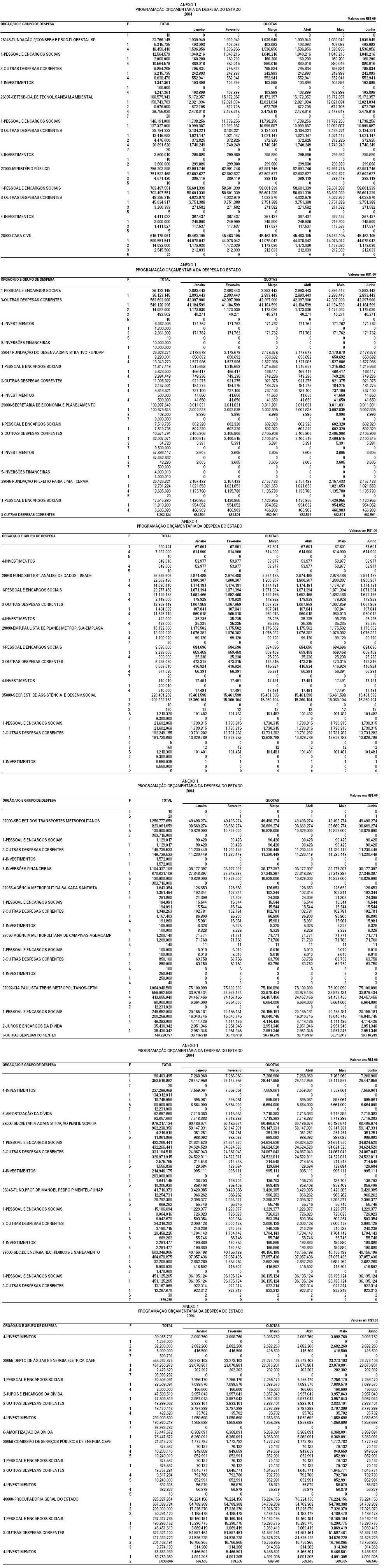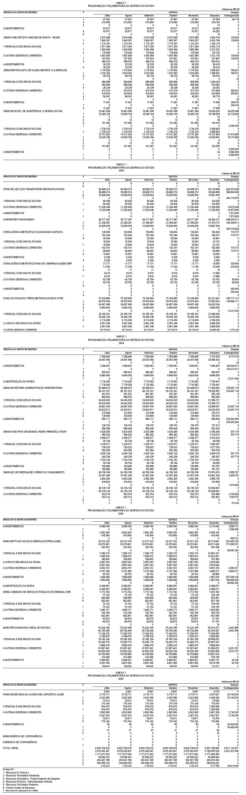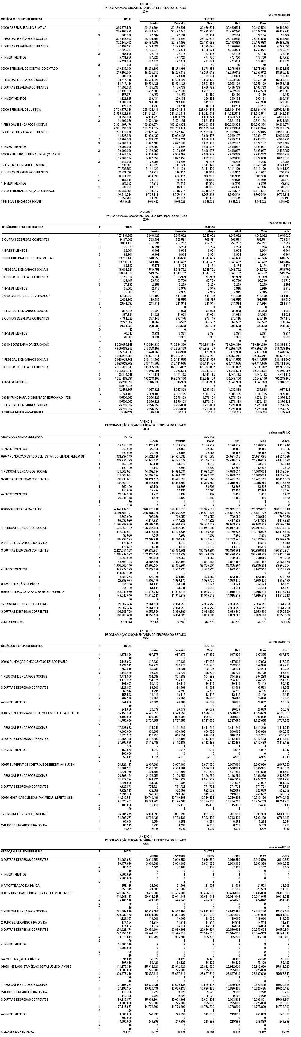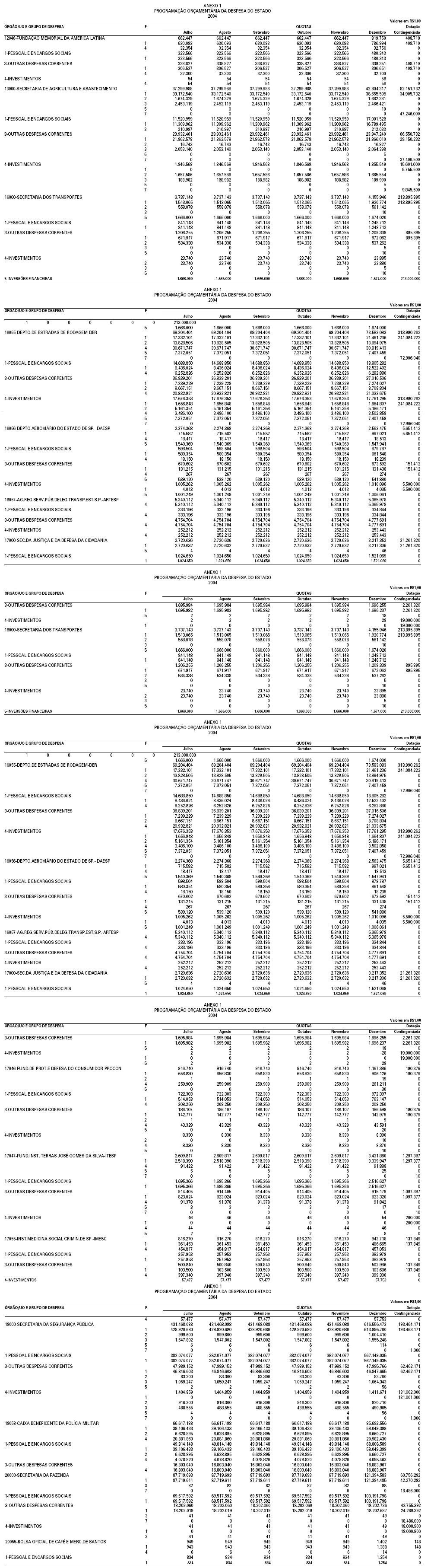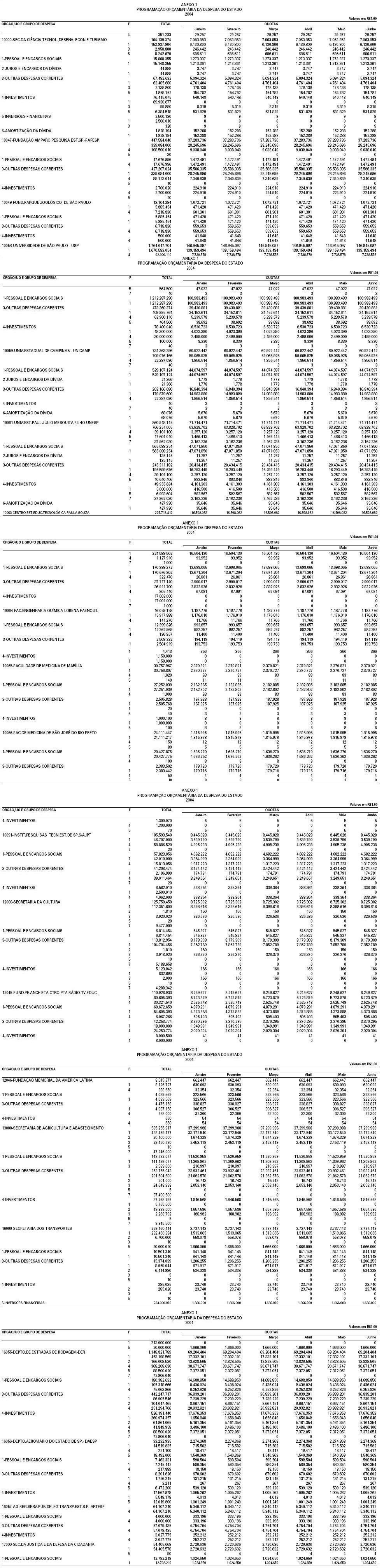 Artigo 8º - A distribuição inicial das dotações orçamentárias aprovadas na forma da Lei nº 11.607, de 29 de dezembro de 2003, se fará automaticamente no SIAFEM/SP, observado o seguinte detalhamento: