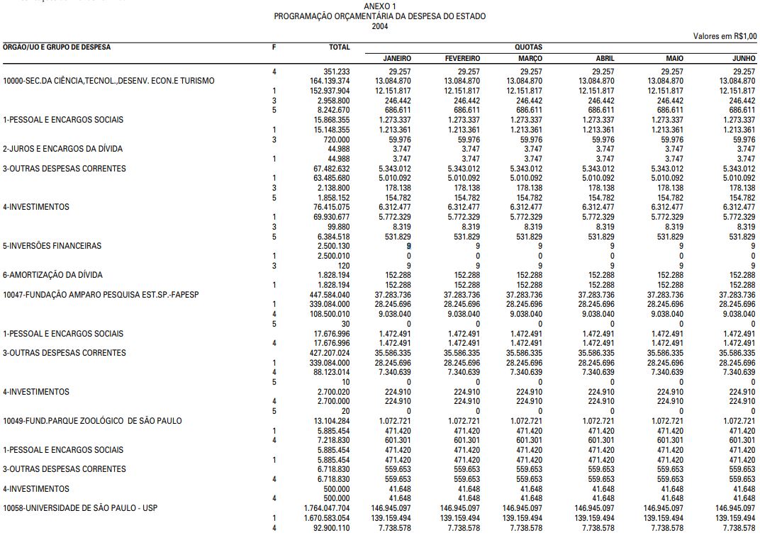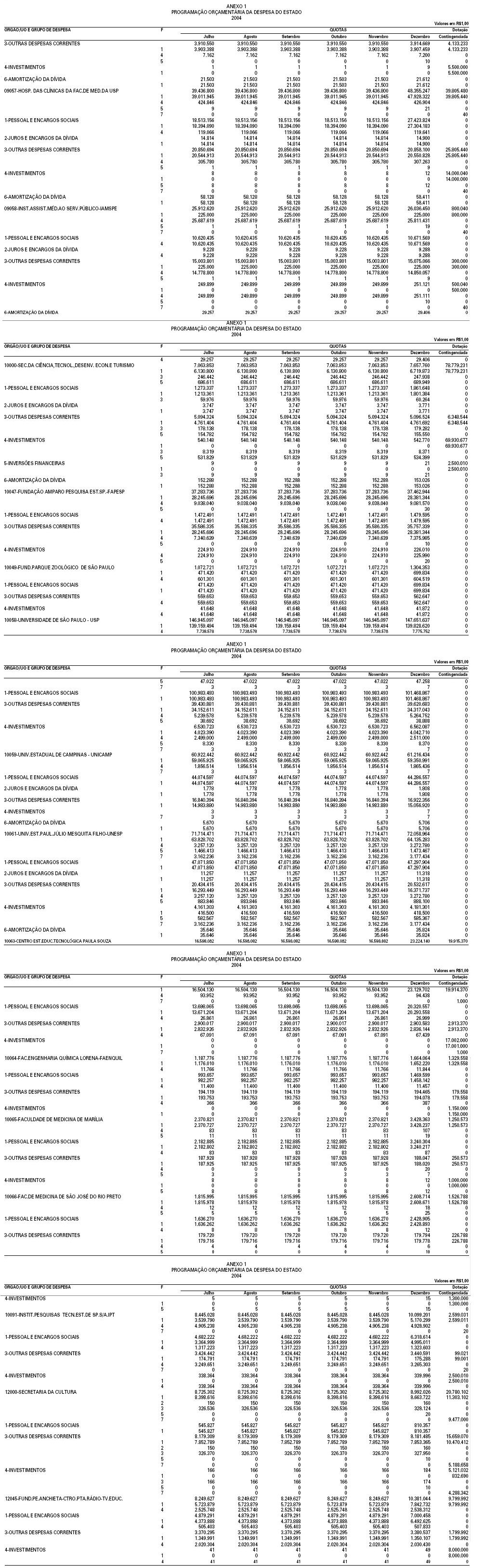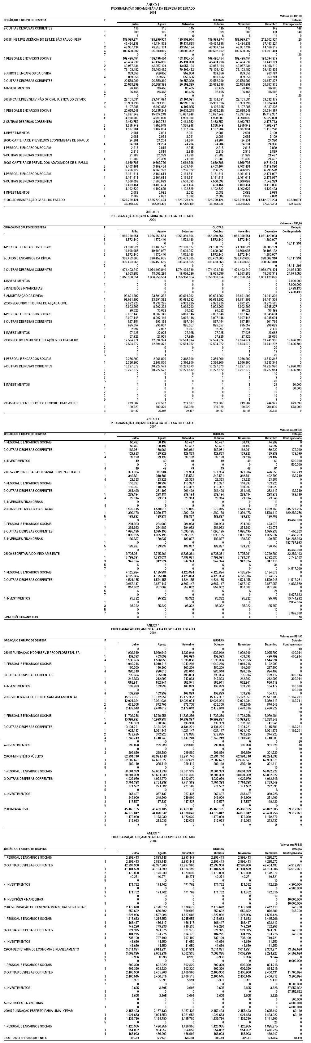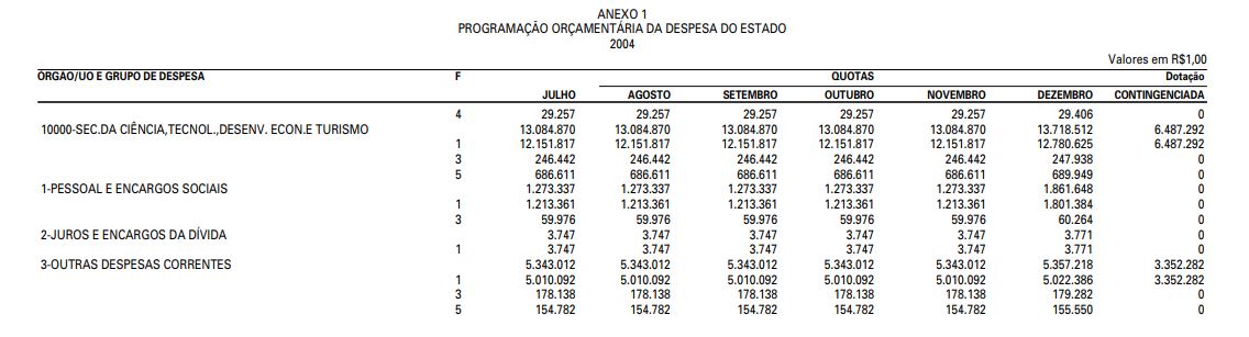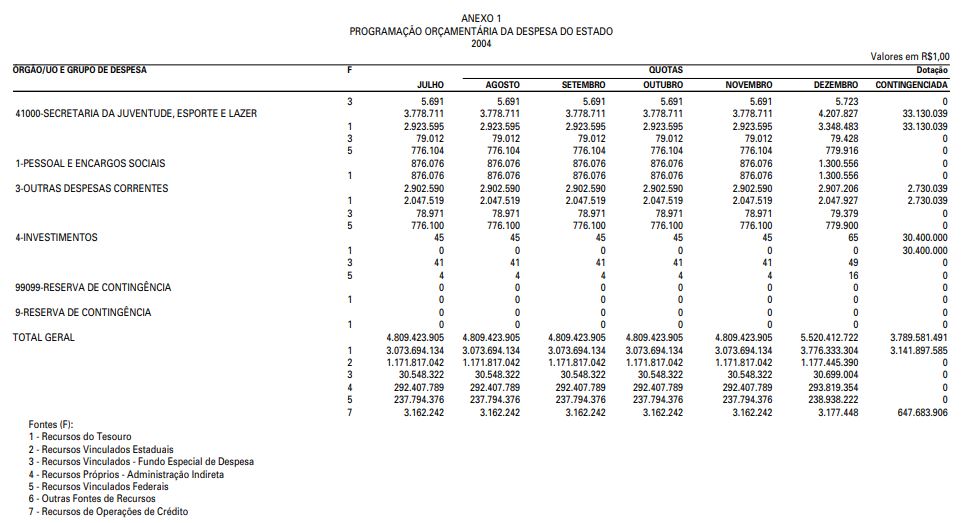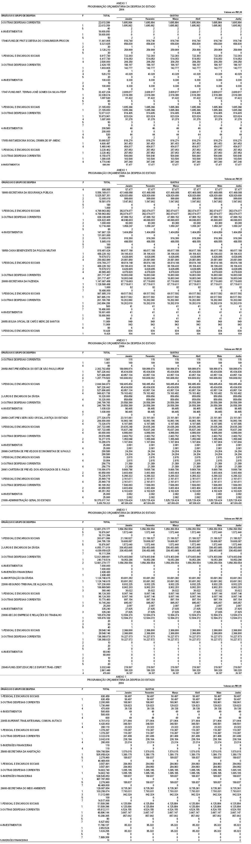 Artigo 8º - A distribuição inicial das dotações orçamentárias aprovadas na forma da Lei nº 11.607, de 29 de dezembro de 2003, se fará automaticamente no SIAFEM/SP, observado o seguinte detalhamento: