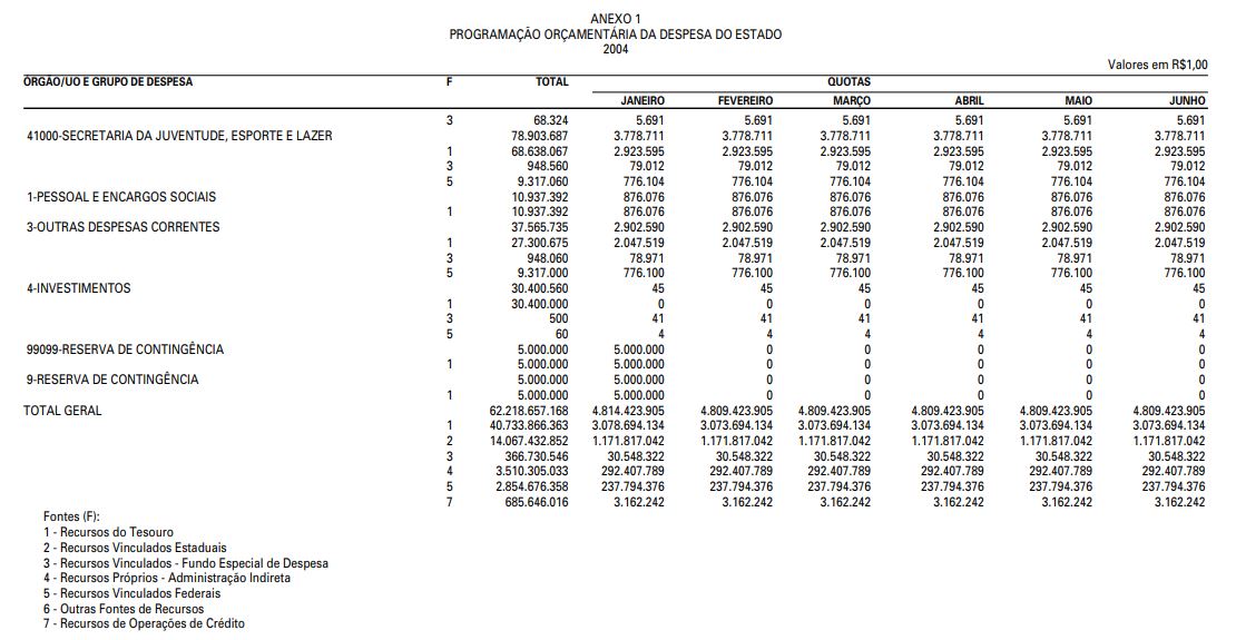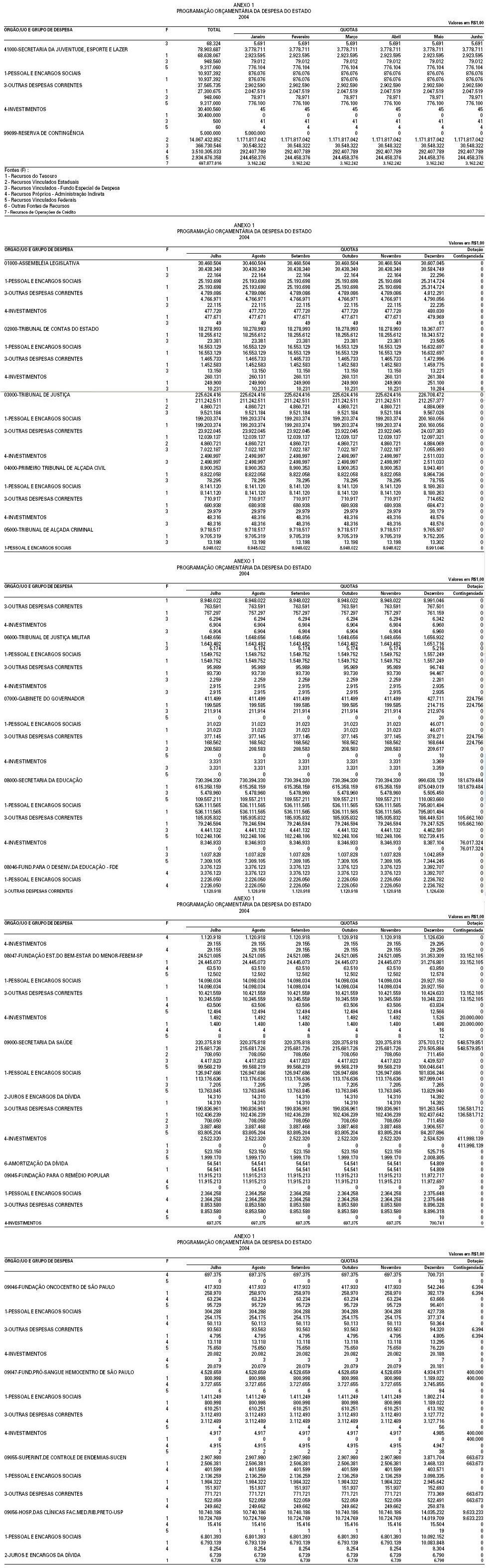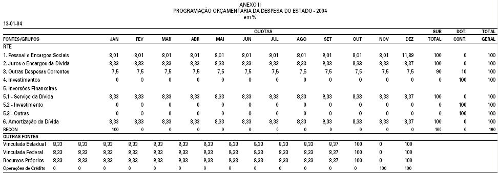 Artigo 6º - A Programação Orçamentária da Despesa do Estado - PODE, é a constante do Anexo I e a sua distribuição por quotas mensais e dotação contingenciada, obedece aos percentuais estabelecidos no Anexo II.