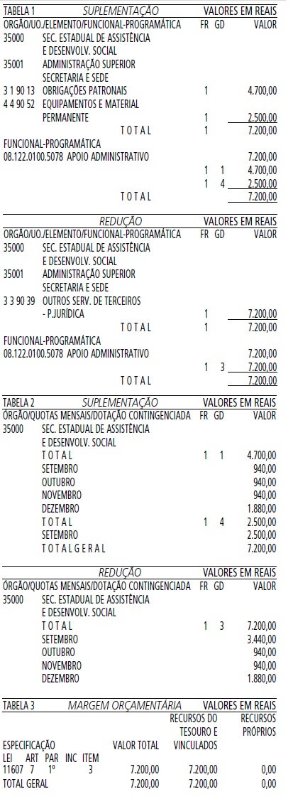 Artigo 1º - Fica aberto um crédito de R$ 7.200,00 (Sete mil e duzentos reais), suplementar ao orçamento da Secretaria Estadual de Assistência e Desenvolvimento Social, observando-se as classificações Institucional, Econômica e Funcional-Programática, conforme a Tabela 1, anexa.