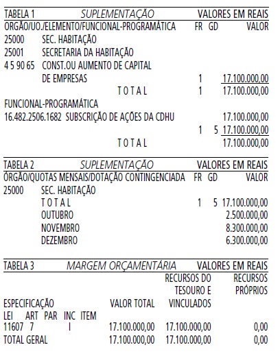 Artigo 1º - Fica aberto um crédito de R$ 17.100.000,00 (Dezessete milhões, cem mil reais), suplementar ao orçamento da Secretaria da Habitação, observando-se as classificações Institucional, Econômica e Funcional-Programática, conforme a Tabela 1, anexa.