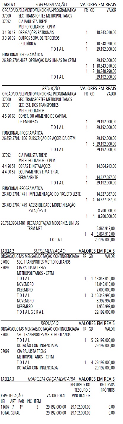 Artigo 1º - Fica aberto um crédito de R$ 29.192.000,00 (Vinte e nove milhões, cento e noventa e dois mil reais), suplementar ao orçamento da Cia. Paulista de Trens Metropolitanos - CPTM, observandose as classificações Institucional, Econômica e Funcional- Programática, conforme a Tabela 1, anexa.