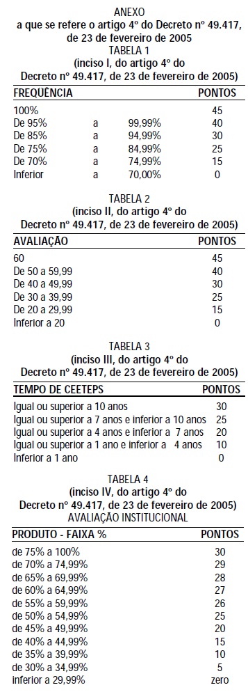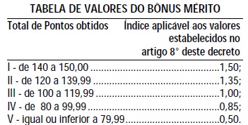 Artigo 4º - O valor do bônus a ser concedido aos servidores de que trata o artigo 2º deste decreto será obtido mediante a soma dos pontos apurados, em conformidade com o Anexo, parte integrante deste decreto, como segue: