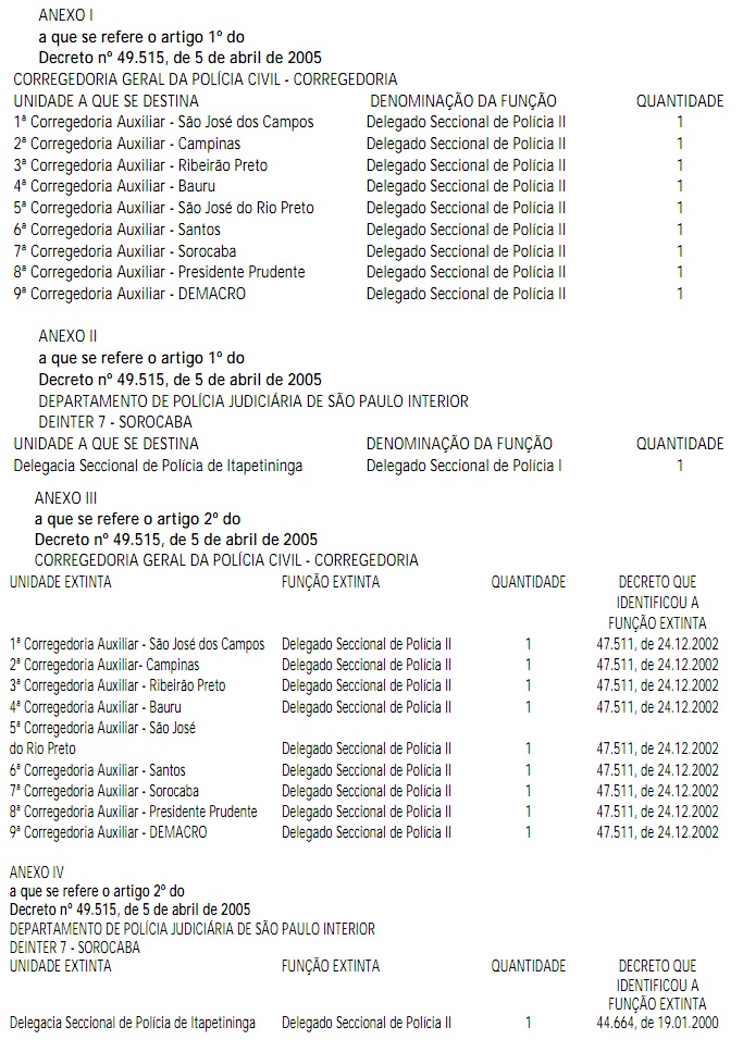 Artigo 2º - Ficam extintas as funções de direção, constantes dos Anexos III e IV, que fazem parte integrante deste decreto, específicas da carreira de Delegado de Polícia, identificadas para fins de atribuição da gratificação "pro labore" com fundamento no artigo 4º da Lei Complementar nº 545, de 24 de junho de 1988 e alterações posteriores destinadas às unidades neles discriminadas, em virtude do disposto no artigo 1º do Decreto nº 46.589, de 8 de março de 2002 e do artigo 31 do Decreto nº 49.264, de 20 de dezembro de 2004.