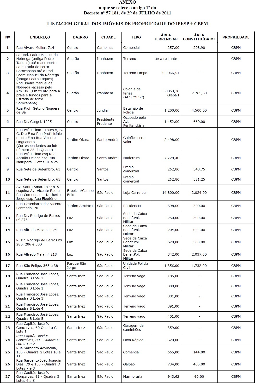 Anexo que fica fazendo parte integrante deste decreto, pertencentes ao