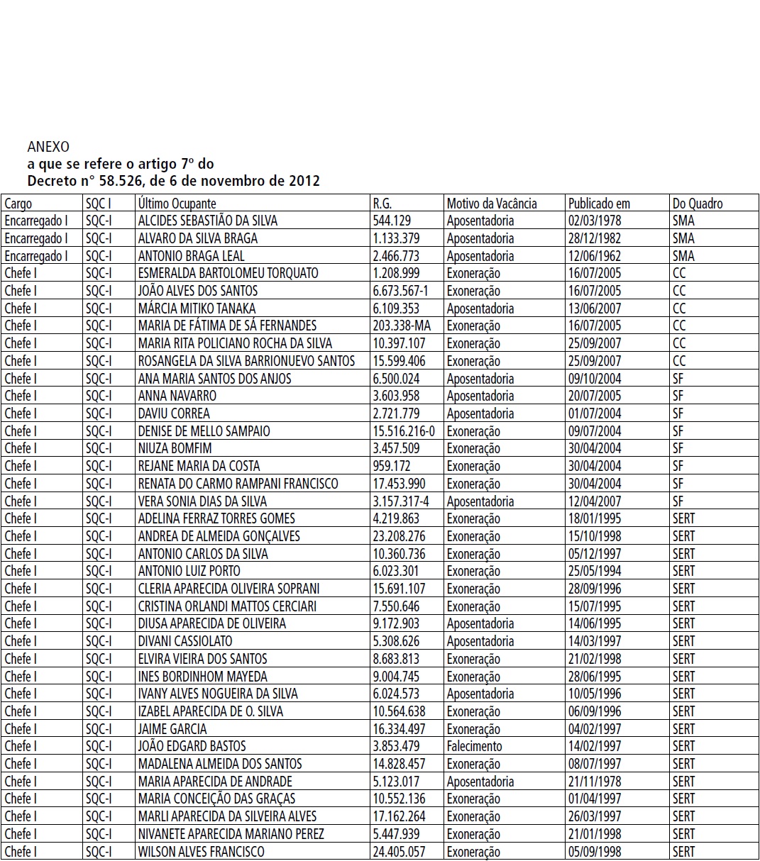 DECRETO Nº 58.526, DE 6 DE NOVEMBRO DE 2012