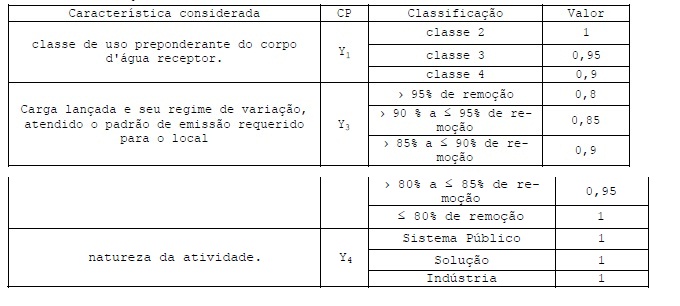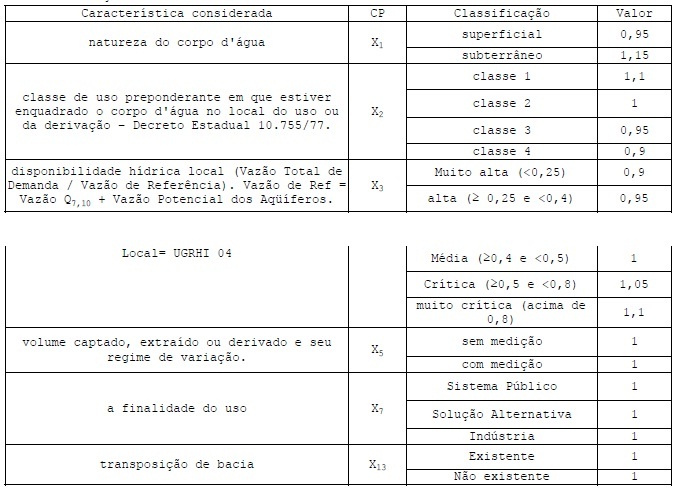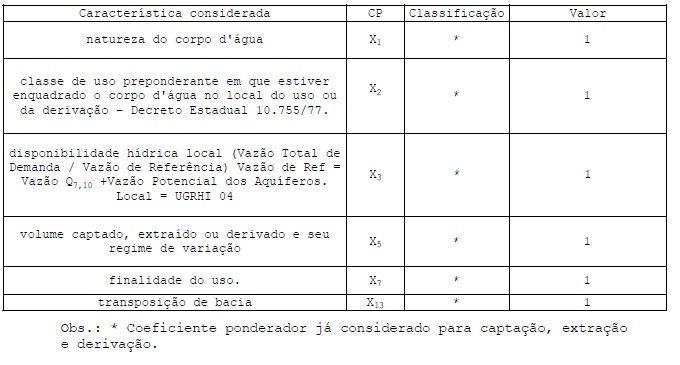 6. Os Coeficientes Ponderadores - CP, definidos no artigo 12 do Decreto nº 50.667, de 30 de março de 2006, com as classificações, valores e condicionantes descritos na Resolução CRH nº 90, de 10 de dezembro de 2008, serão empregados conforme segue: