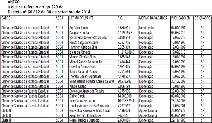Artigo 229 - Ficam extintos, no Quadro da Secretaria da Fazenda, os seguintes cargos vagos, identificados no Anexo que faz parte integrante deste decreto: