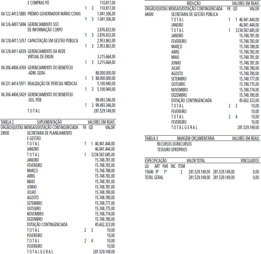 Artigo 1º - Fica aberto um crédito de R$ 281.529.149,00 (Duzentos e oitenta e um milhões, quinhentos e vinte e nove mil, cento e quarenta e nove reais), suplementar ao orçamento da Secretaria de Planejamento e Gestão, observando-se as classificações Institucional, Econômica, Funcional e Programática, conforme a Tabela 1, anexa.