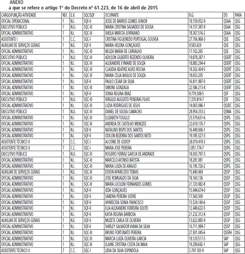 DECRETO Nº 61.223, DE 16 DE ABRIL DE 2015