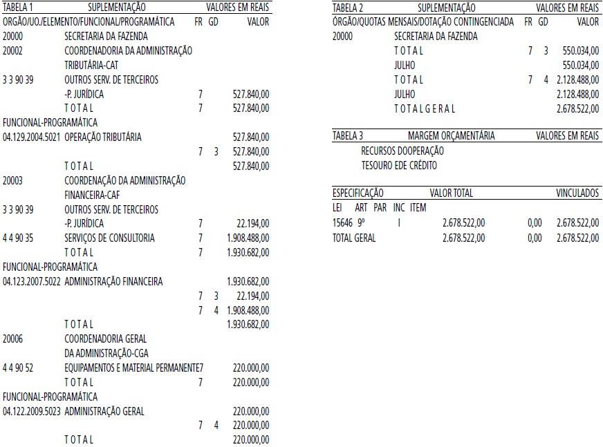 Artigo 1º - Fica aberto um crédito de R$ 2.678.522,00 (Dois milhões, seiscentos e setenta e oito mil, quinhentos e vinte e dois reais), suplementar ao orçamento da Secretaria da Fazenda, observando-se as classificações Institucional, Econômica, Funcional e Programática, conforme a Tabela 1, anexa.