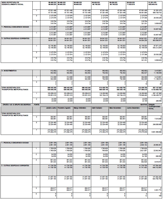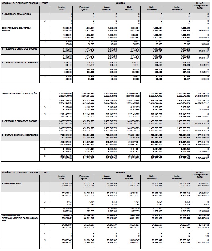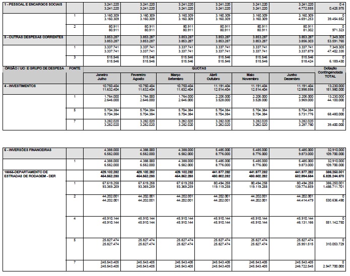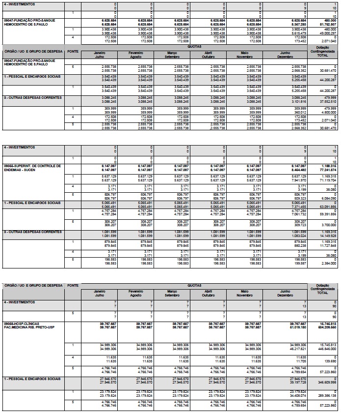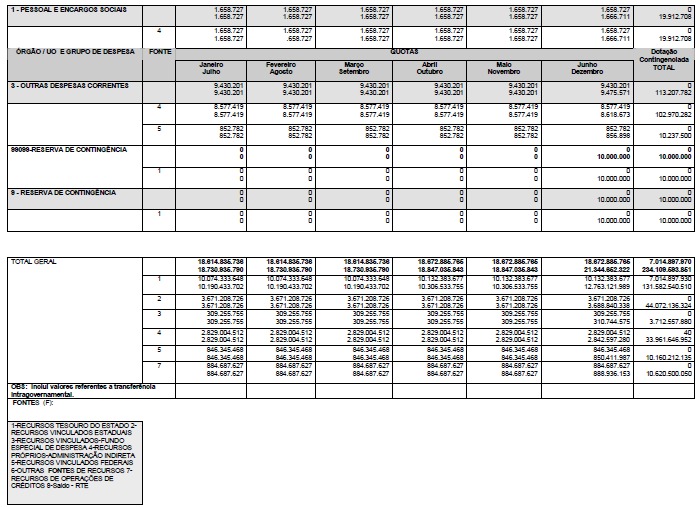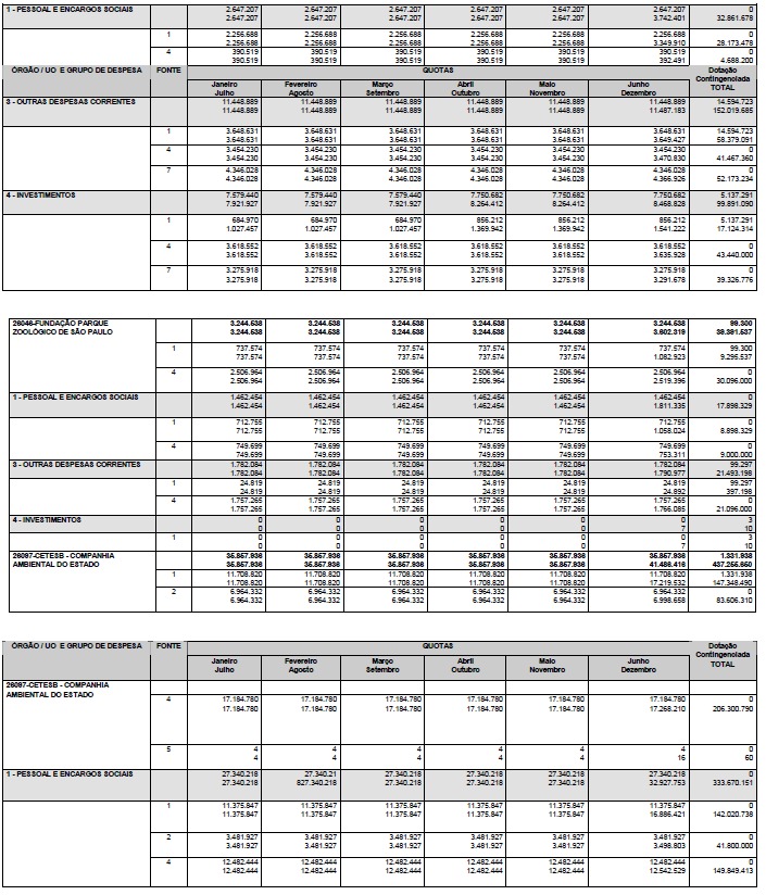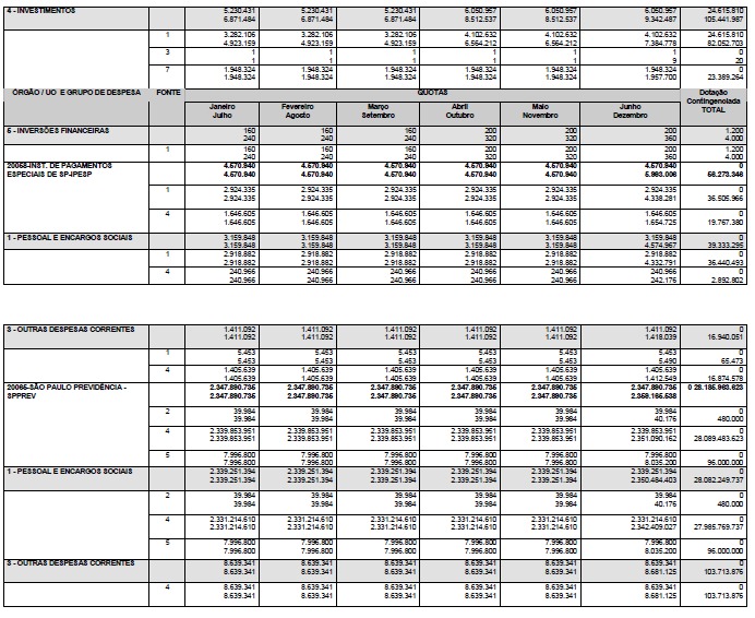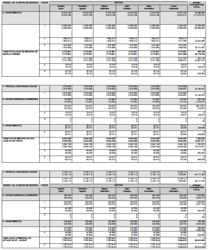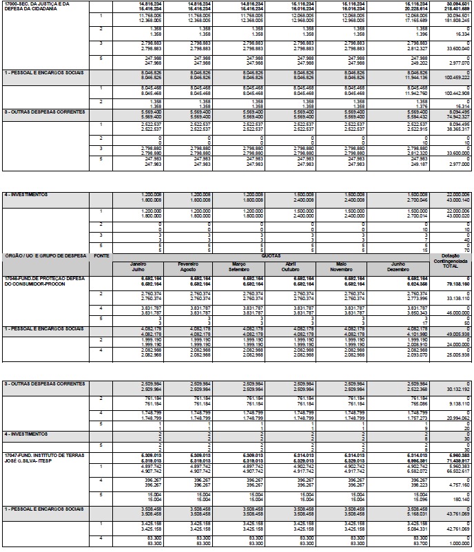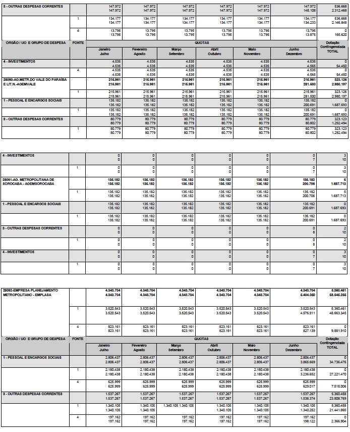 § 1º - A distribuição das dotações orçamentárias, por quotas, do Anexo, será automaticamente disponibilizada no SIAFEM/SP com o seguinte detalhamento: