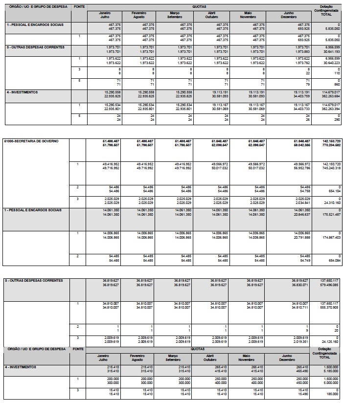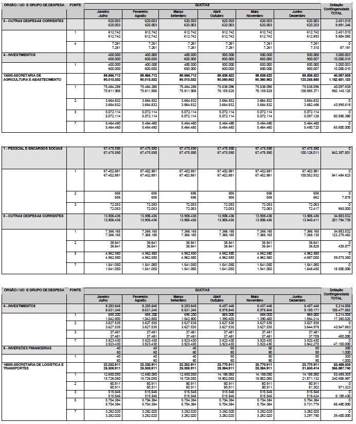 Artigo 7º - A Programação Orçamentária da Despesa do Estado é apresentada no Anexo único deste decreto e reflete as dotações estabelecidas no orçamento aprovado pela Lei nº 16.083, de 28 de dezembro de 2015, distribuídas em quotas, sendo uma contingenciada e as demais, mensais, correspondendo aos limites orçamentários, compatibilizados com as projeções das disponibilidades do Tesouro Estadual para o exercício.