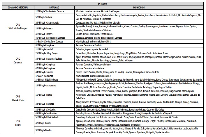 f) Comando de Policiamento do Interior-4 (CPI-4), sediado em Bauru: Região Administrativa de Bauru e parte da Região Administrativa de Marília;