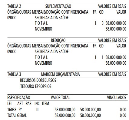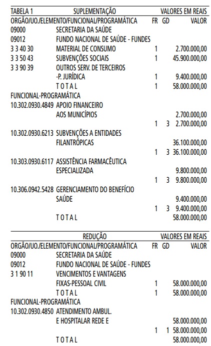 Artigo 1º - Fica aberto um crédito de R$ 58.000.000,00 (Cinquenta e oito milhões de reais), suplementar ao orçamento da Secretaria da Saúde, observando-se as classificações Institucional, Econômica, Funcional e Programática, conforme a Tabela 1, anexa.