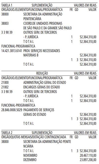 Artigo 1º - Fica aberto um crédito de R$ 52.364.310,00 (Cinquenta e dois milhões, trezentos e sessenta e quatro mil, trezentos e dez reais), suplementar ao orçamento da Secretaria da Administração Penitenciária, observando-se as classificações Institucional, Econômica, Funcional e Programática, conforme a Tabela 1, anexa.