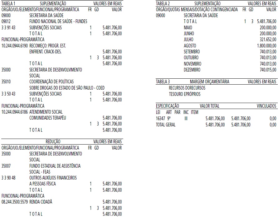 Artigo 1º - Fica aberto um crédito de R$ 5.481.706,00 (Cinco milhões, quatrocentos e oitenta e um mil, setecentos e seis reais), suplementar ao orçamento de Diversos Órgãos da Administração Pública, observando-se as classificações Institucional, Econômica, Funcional e Programática, conforme a Tabela 1, anexa.
