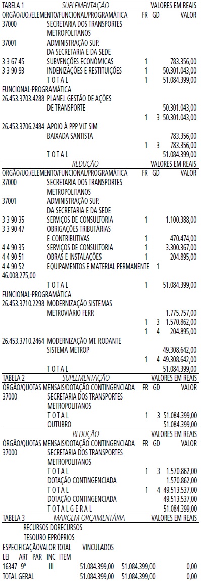 Artigo 1º - Fica aberto um crédito de R$ 51.084.399,00 (Cinquenta e um milhões, oitenta e quatro mil, trezentos e noventa e nove reais), suplementar ao orçamento da Secretaria dos Transportes Metropolitanos, observando-se as classificações Institucional, Econômica, Funcional e Programática, conforme a Tabela 1, anexa.