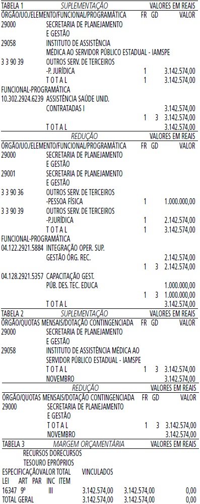 Artigo 1º - Fica aberto um crédito de R$ 3.142.574,00 (Três milhões, cento e quarenta e dois mil, quinhentos e setenta e quatro reais), suplementar ao orçamento do Instituto de Assistência Médica ao Servidor Público Estadual - IAMSPE, observando-se as classificações Institucional, Econômica, Funcional e Programática, conforme a Tabela 1, anexa.