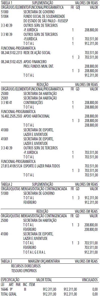 Artigo 1º - Fica aberto um crédito de R$ 912.311,00 (Novecentos e doze mil, trezentos e onze reais), suplementar ao orçamento da Secretaria de Governo, observando-se as classificações Institucional, Econômica, Funcional e Programática, conforme a Tabela 1, anexa.
