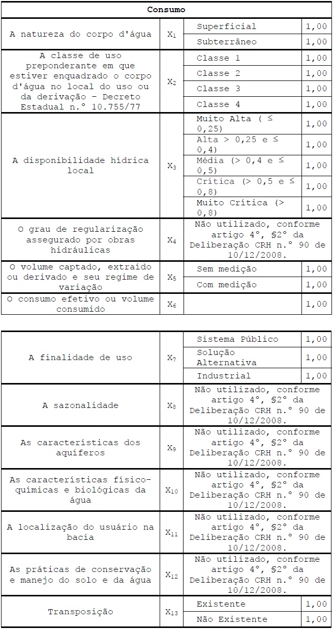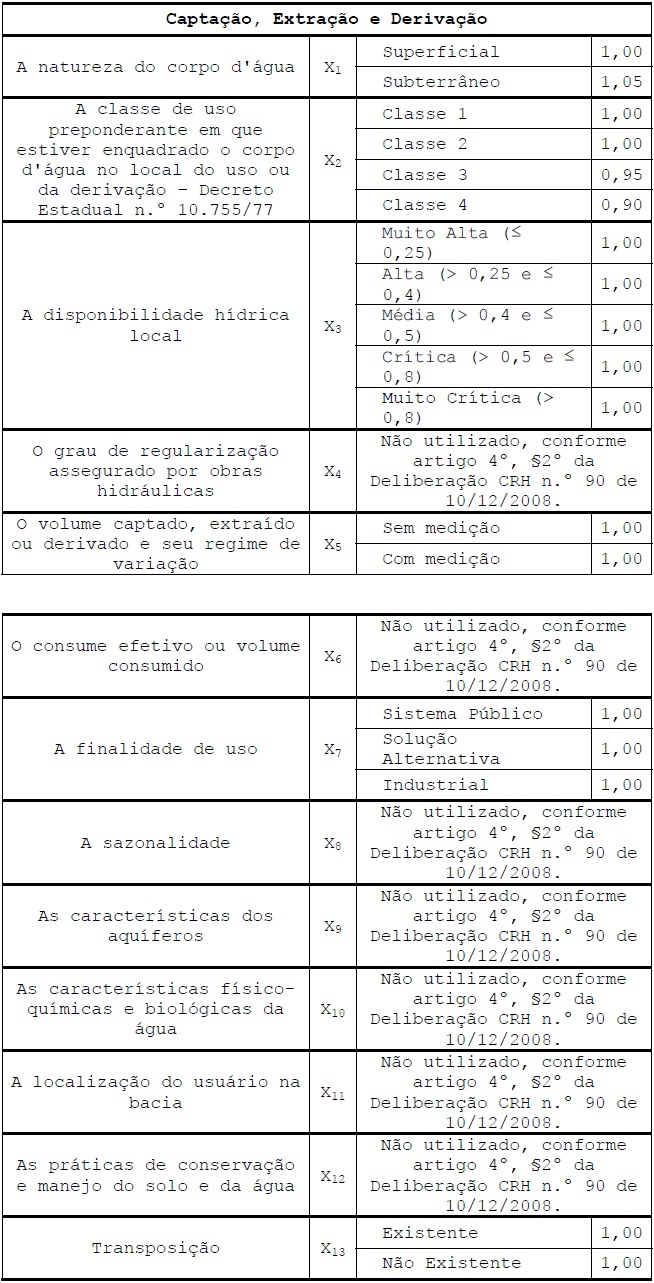 6.1. Valores dos Coeficientes Ponderadores para captação, extração, derivação.
