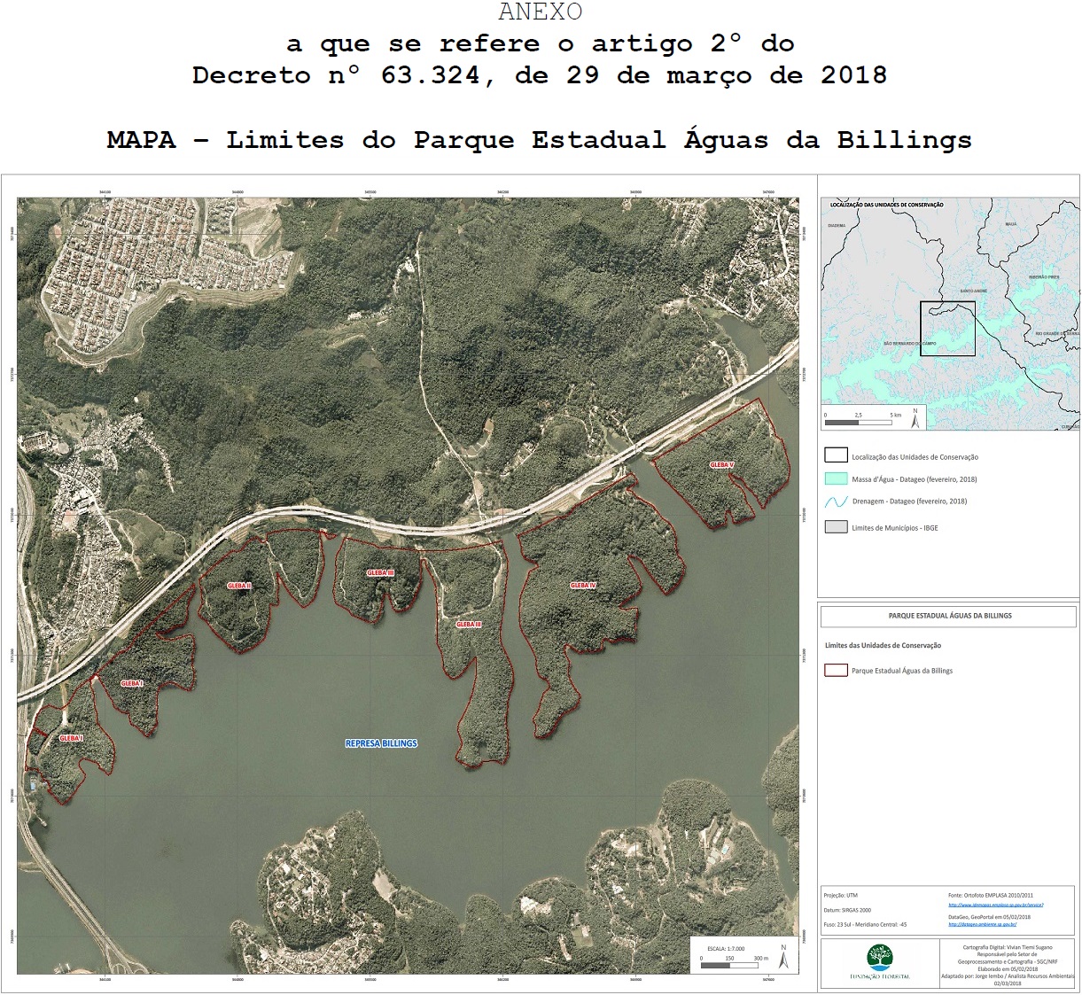 Artigo 2º - O Parque Estadual Águas da Billings abrangerá uma área de 187,60 hectares, localizada no Município de São Bernardo do Campo, com área delimitada conforme o memorial descritivo e mapa, constantes do ANEXO que faz parte integrante deste decreto.