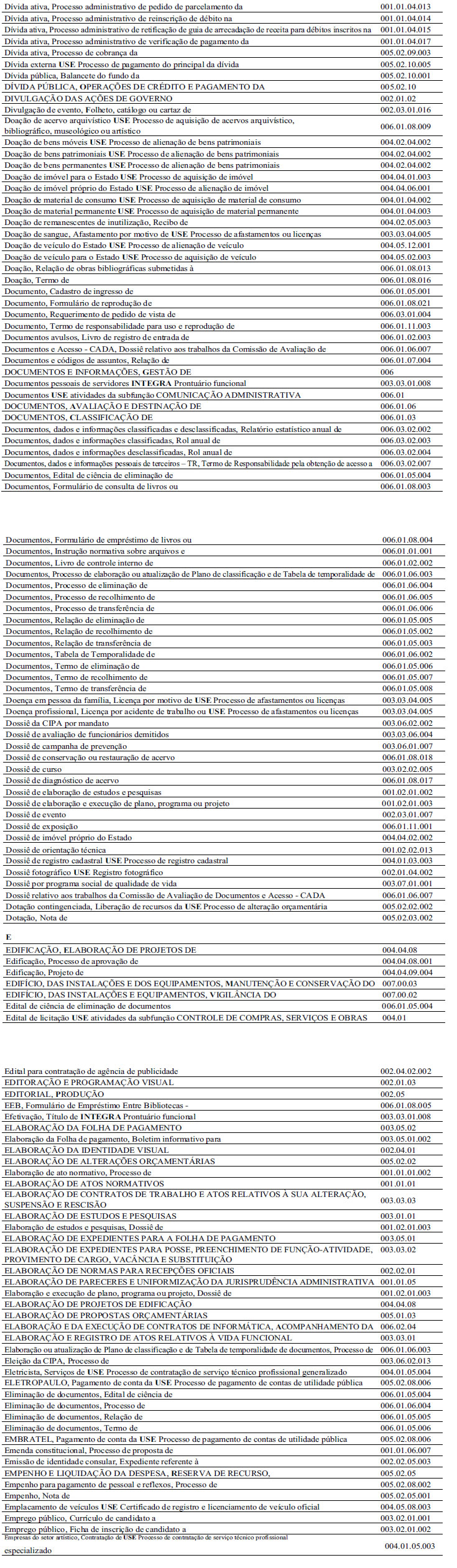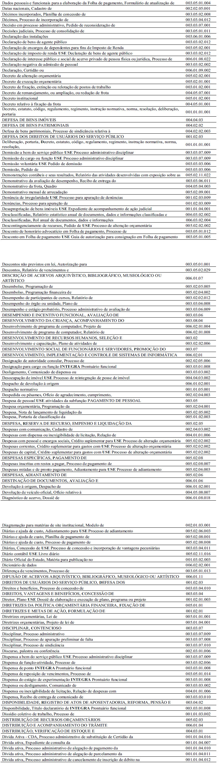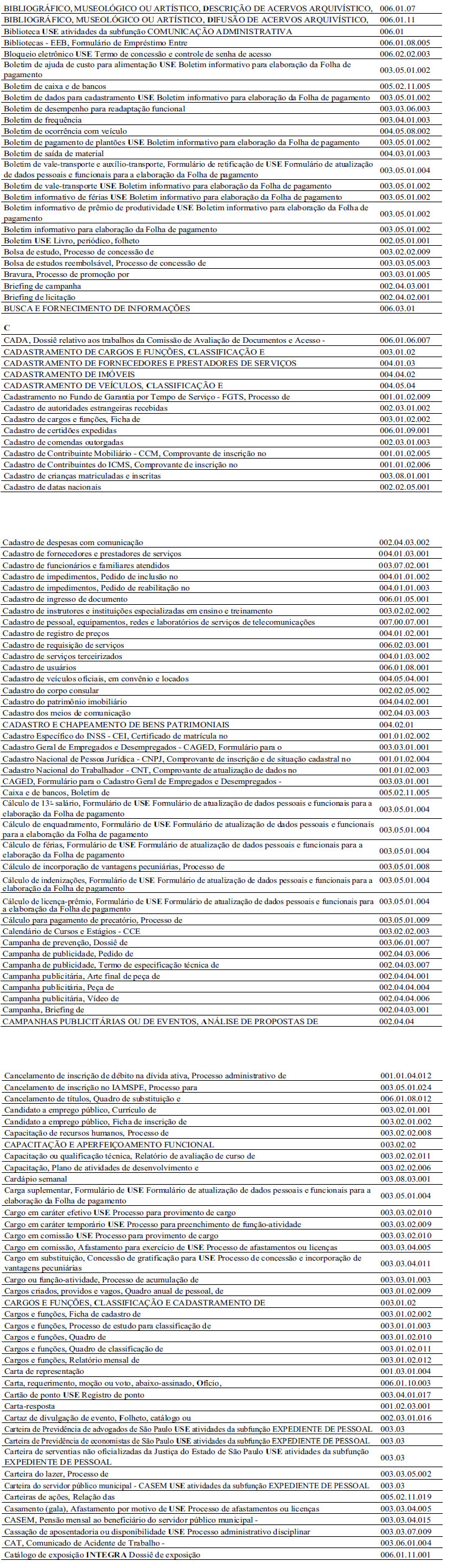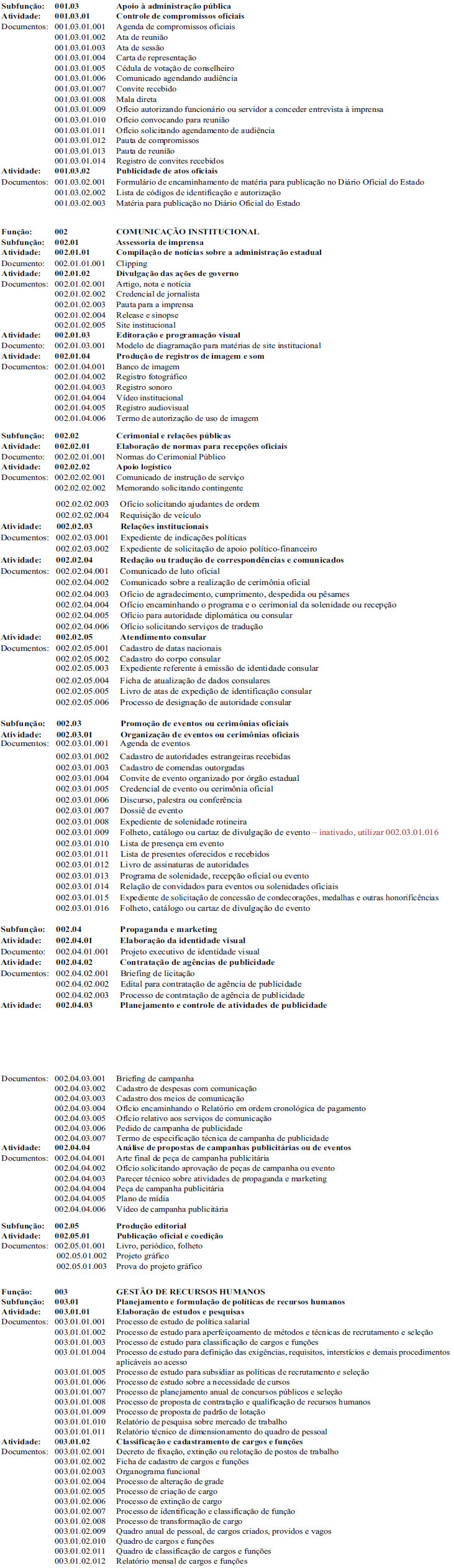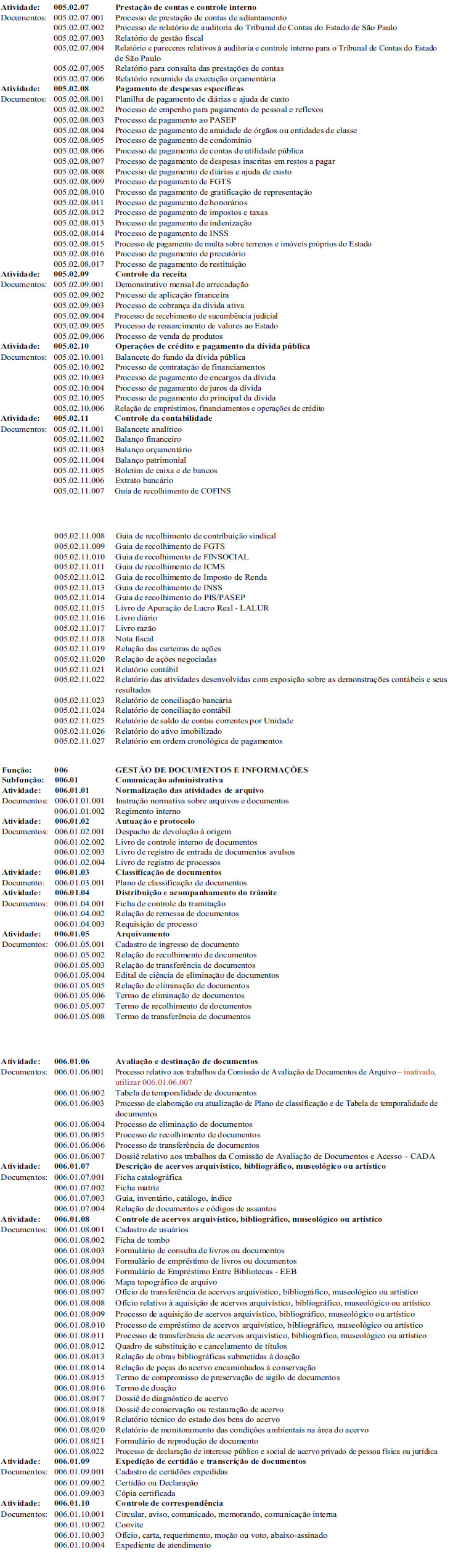 006.01 Comunicação administrativa (SUBFUNÇÃO) Esta subfunção refere-se às atividades relativas ao recebimento, registro, classificação, arquivamento, avaliação e descrição de documentos, assim como ao controle dos acervos arquivístico, bibliográfico, museológico ou artístico.