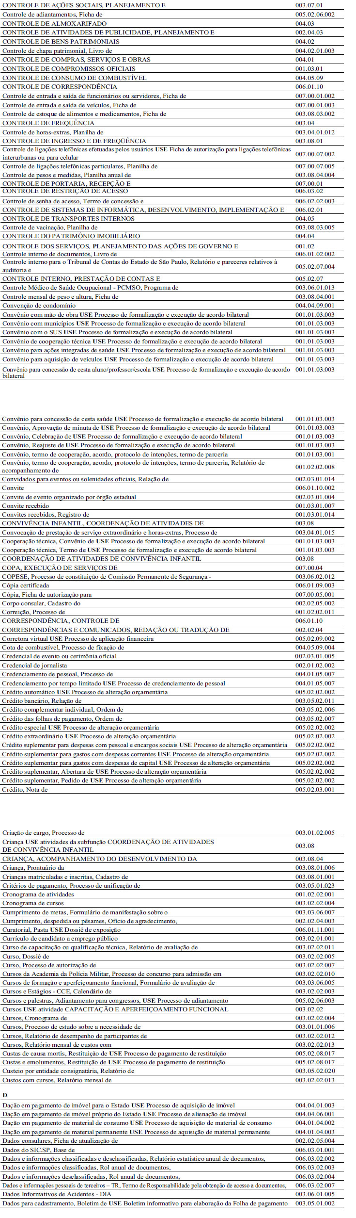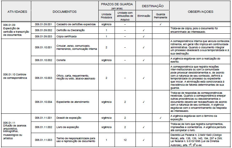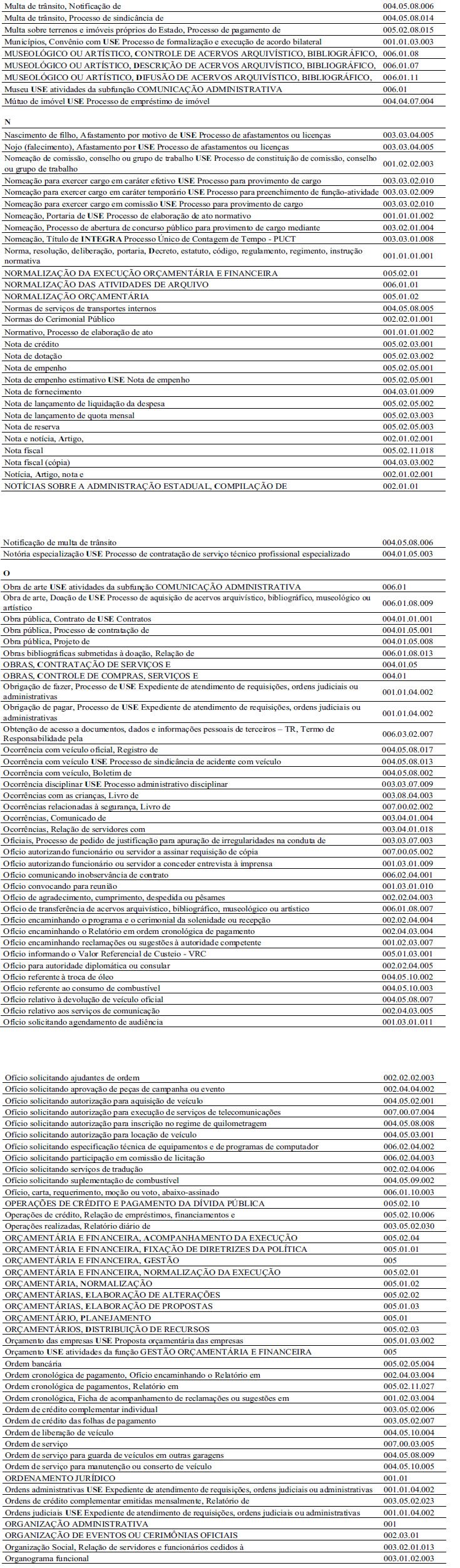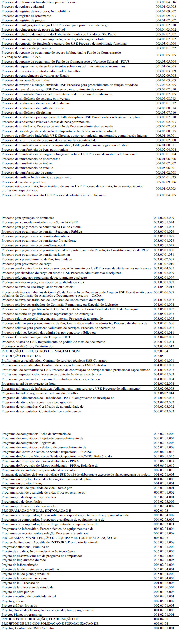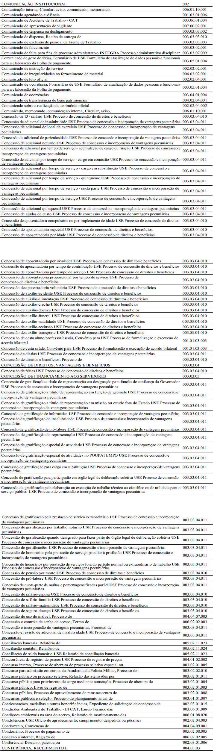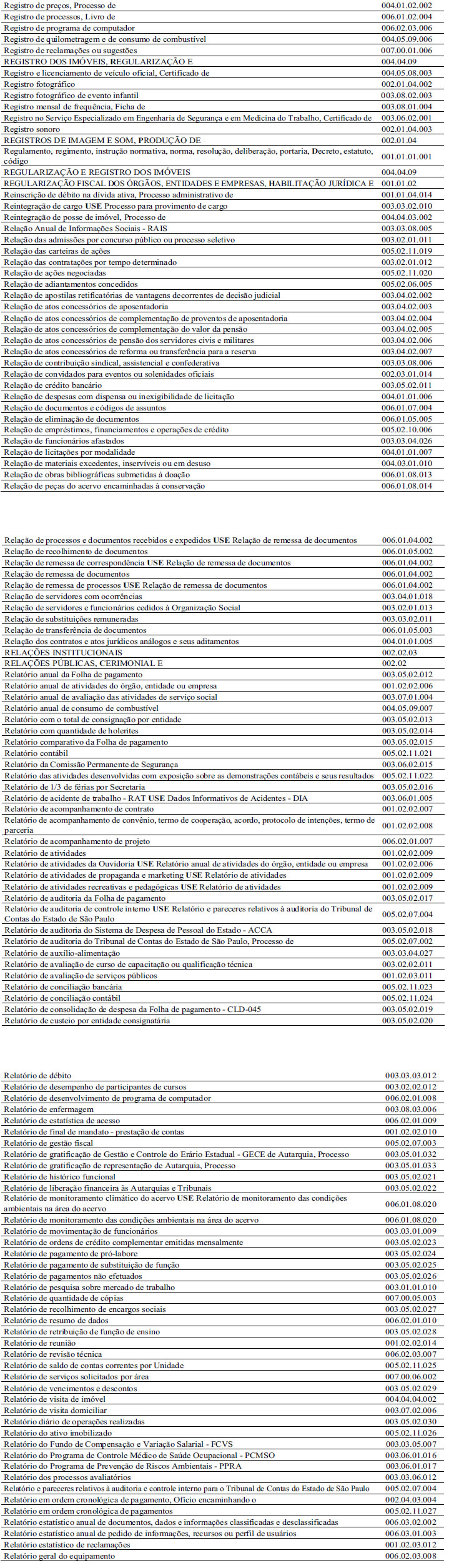 006.01 Comunicação administrativa (SUBFUNÇÃO) Esta subfunção refere-se às atividades relativas ao recebimento, registro, classificação, arquivamento, avaliação e descrição de documentos, assim como ao controle dos acervos arquivístico, bibliográfico, museológico ou artístico.
