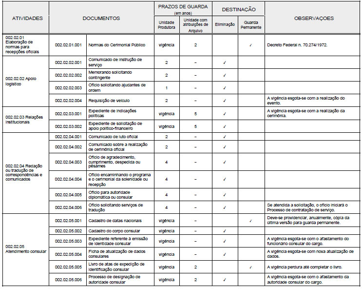 Esta subfunção refere-se ao conjunto de formalidades que devem ser obedecidas nas cerimônias oficiais, incluindo-se pessoal a ser convocado, normas para a execução de atos e serviços e todo o atendimento consular, além dos parâmetros de governo para o estabelecimento de relações institucionais.