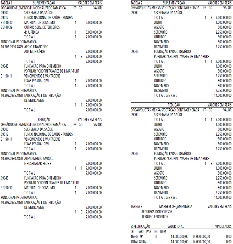 MÁRCIO FRANÇA, Governador do Estado de São Paulo, no uso de suas atribuições legais, considerando o disposto no artigo 9º da Lei nº 16.646, de 11 de janeiro de 2018,