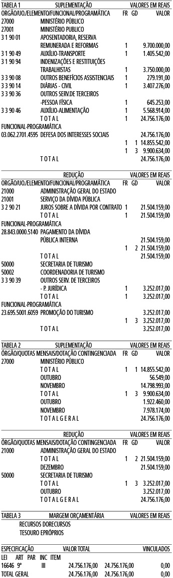Artigo 1º - Fica aberto um crédito de R$ 24.756.176,00 (Vinte e quatro milhões, setecentos e cinquenta e seis mil, cento e setenta e seis reais), suplementar ao orçamento do Ministério Público, observando-se as classificações Institucional, Econômica, Funcional e Programática, conforme a Tabela 1, anexa.