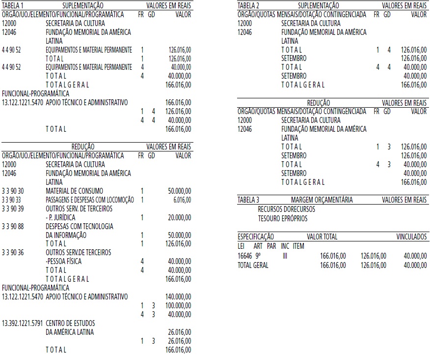 Artigo 1º - Fica aberto um crédito de R$ 166.016,00 (Cento e sessenta e seis mil, dezesseis reais), suplementar ao orçamento da Fundação Memorial da América Latina, observando-se as classificações Institucional, Econômica, Funcional e Programática, conforme a Tabela 1, anexa.