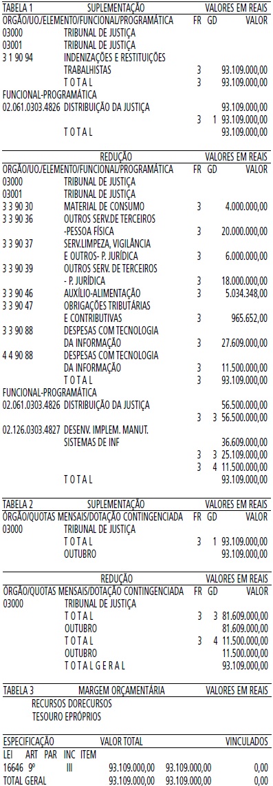 Artigo 1º - Fica aberto um crédito de R$ 93.109.000,00 (Noventa e três milhões, cento e nove mil reais), suplementar ao orçamento do Tribunal de Justiça, observando-se as classificações Institucional, Econômica, Funcional e Programática, conforme a Tabela 1, anexa.
