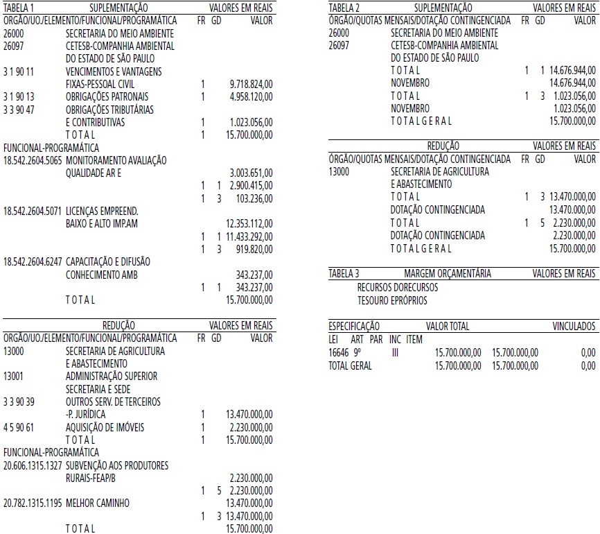 Artigo 1º - Fica aberto um crédito de R$ 15.700.000,00 (Quinze milhões, setecentos mil reais), suplementar ao orçamento da Companhia Ambiental do Estado de São Paulo - CETESB, observando-se as classificações Institucional, Econômica, Funcional e Programática, conforme a Tabela 1, anexa.