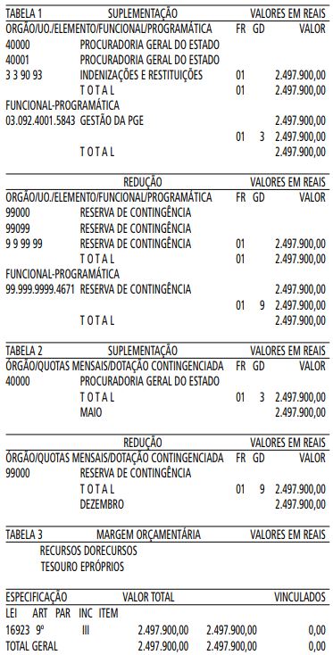 Artigo 1º - Fica aberto um crédito de R$ 2.497.900,00 (Dois milhões, quatrocentos e noventa e sete mil, novecentos reais), suplementar ao orçamento da Procuradoria Geral do Estado, observando-se as classificações Institucional, Econômica, Funcional e Programática, conforme a Tabela 1, anexa.