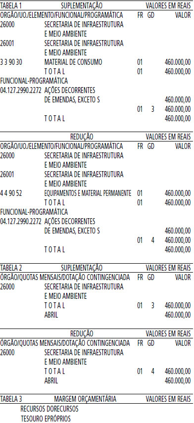 Artigo 1º - Fica aberto um crédito de R$ 460.000,00 (Quatrocentos e sessenta mil reais), suplementar ao orçamento da Secretaria de Infraestrutura e Meio Ambiente, observando-se as classificações Institucional, Econômica, Funcional e Programática, conforme a Tabela 1, anexa.