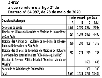 “Artigo 2º - Fica fixado para as unidades de saúde, a que se refere o artigo 1º deste decreto, o limite máximo de 18.436 (dezoito mil, quatrocentos e trinta e seis) Plantões por mês, identificados por áreas, nos termos do § 3º do artigo 1º da Lei Complementar nº 1.176, de 30 de maio de 2012, na seguinte conformidade: