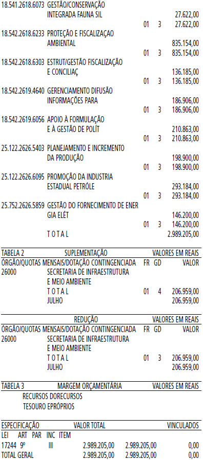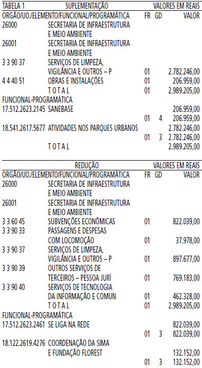 Artigo 1º - Fica aberto um crédito de R$ 2.989.205,00 (Dois milhões, novecentos e oitenta e nove mil, duzentos e cinco reais), suplementar ao orçamento da Secretaria de Infraestrutura e Meio Ambiente, observando-se as classificações Institucional, Econômica, Funcional e Programática, conforme a Tabela 1, anexa.