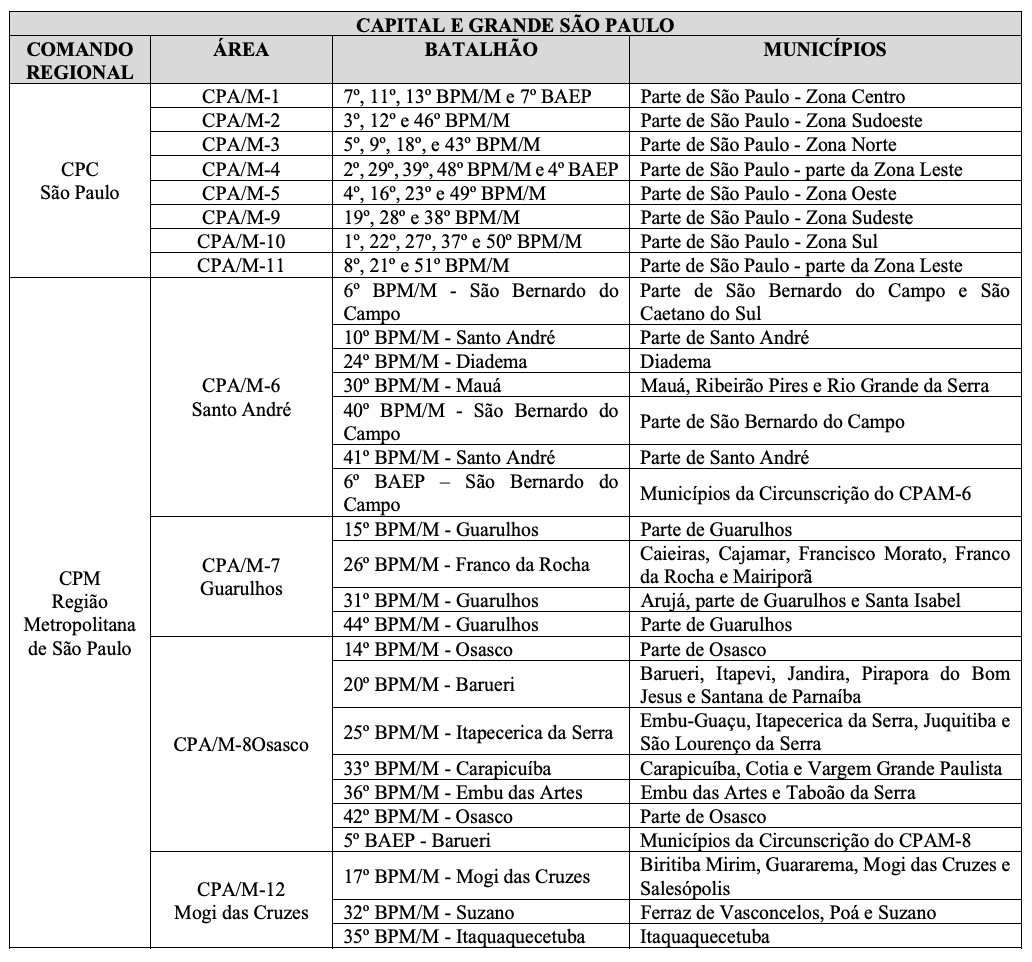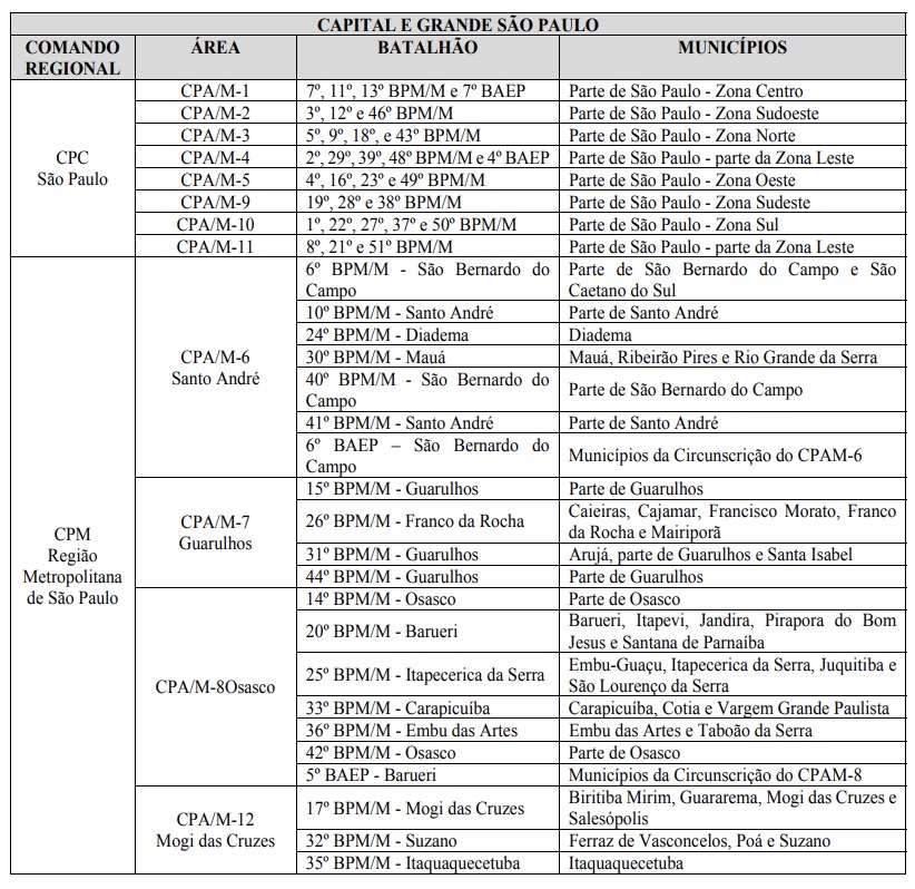 b) Comando de Policiamento Metropolitano (CPM), sediado em Município da Região Metropolitana de São Paulo: Região Metropolitana de São Paulo, exceto Capital;